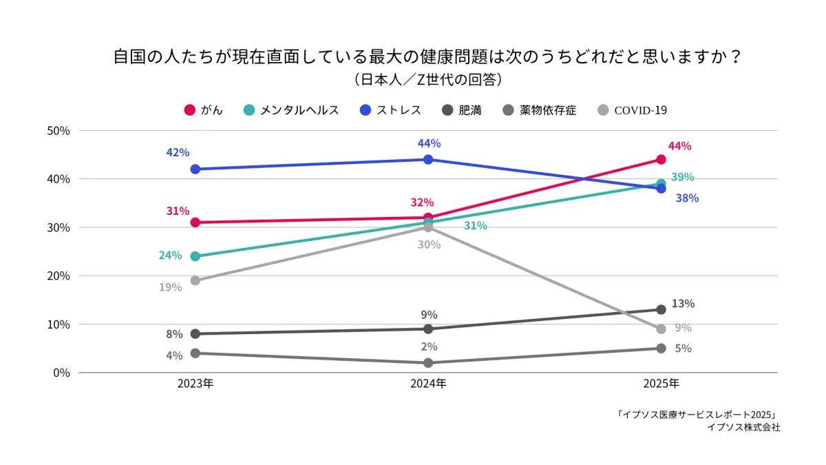 最近発表されたイプソスの調査結果によれば、Z世代が抱える健康不安の最重要課題として「がん」が1位となり、特に驚くべきはその割合が一昨年の31%から44%に増加したことです。この13ポイントの増加は、世代を超えた深刻な健康問題としての認識変化を示しています。