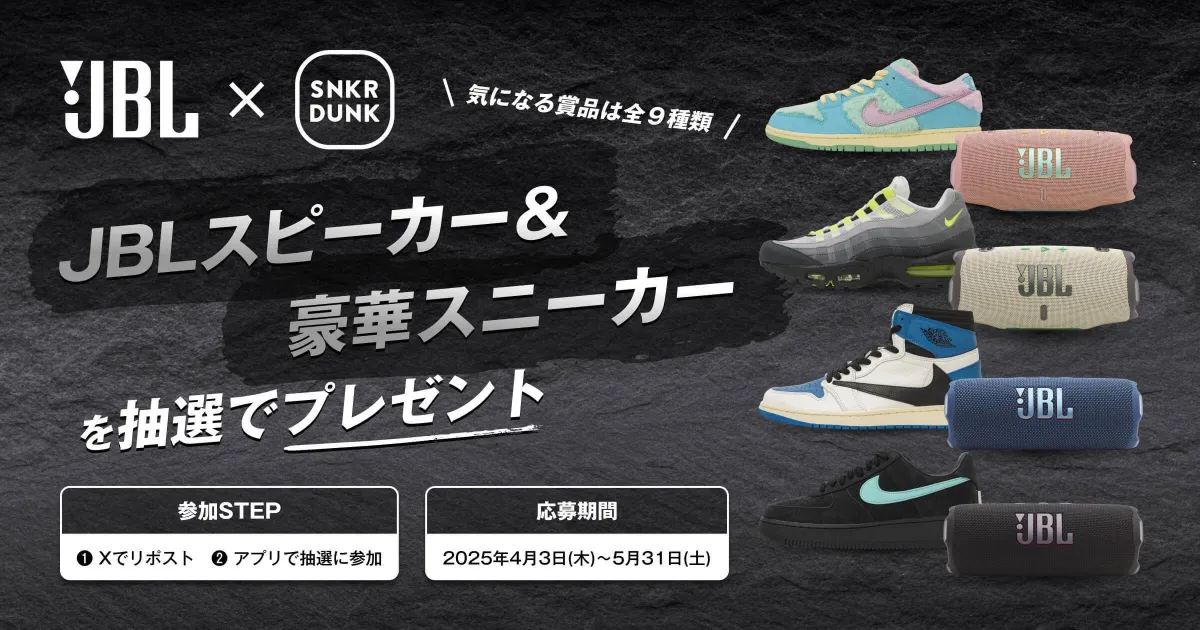 日本のスニーカーとストリートファッションを愛する人々に朗報です。スニーカー取り扱いフリマアプリ「SNKRDUNK(スニダン)」が、世界的なオーディオブランド「JBL」と提携し、特別なキャンペーンを実施します。このキャンペーンは、2025年4月3日から5月31日までの期間、スニーカーと最新のBluetoothスピーカーがセットになった豪華プレゼントのチャンスを提供し、多くのスニーカー愛好者や音楽ファンの関心を集めること間違いありません。