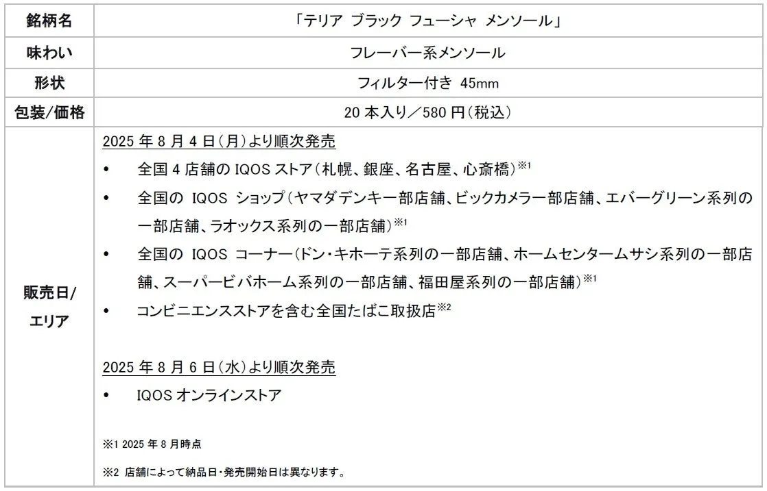 「テリア ブラック フューシャ メンソール」は、2025年8月6日からIQOSオンラインストアでも販売が開始されます。さらに、全国の4店舗のIQOSストアやヤマダデンキ、ビックカメラ、一部のドン・キホーテ系列店舗でもご購入いただけます。これにより、より多くの人々が簡単に新製品にアクセスできる環境が整います。