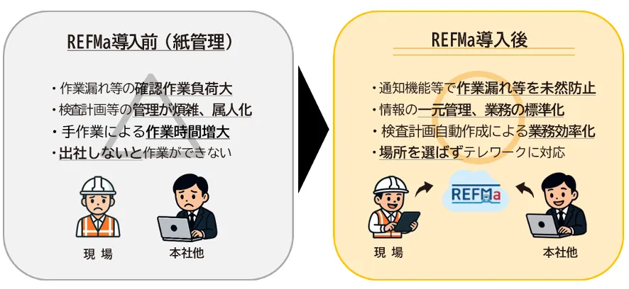 東京メトロは、中期経営計画「Run!~次代を翔けろ~」に基づき、鉄道運営ノウハウを生かして様々な事業領域へ展開を図ってきました。その一環として、REFMaは鉄道電気設備保守管理業務を支援するための強力なプラットフォームとなります。これまで主に紙で行われていた点検や管理業務が、REFMaの導入によってデジタル化され、計画・検査・実績を一元管理することで業務の標準化・効率化が実現されます。この過程で、ヒューマンエラーによる作業漏れを防いだり、ペーパーレス化を推進することが可能になります。