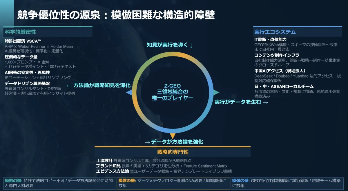 Z Creative Partnersによって開発されたVSCA™は、AHP(階層分析法)やHölder Meanを利用して、AI上でのブランドプレゼンスを科学的に測定しています。VSCAスコアをもとに、AI経由の収益向上を予測し、企業がどのようにGEO戦略を採用するべきかの指針を提供しています。