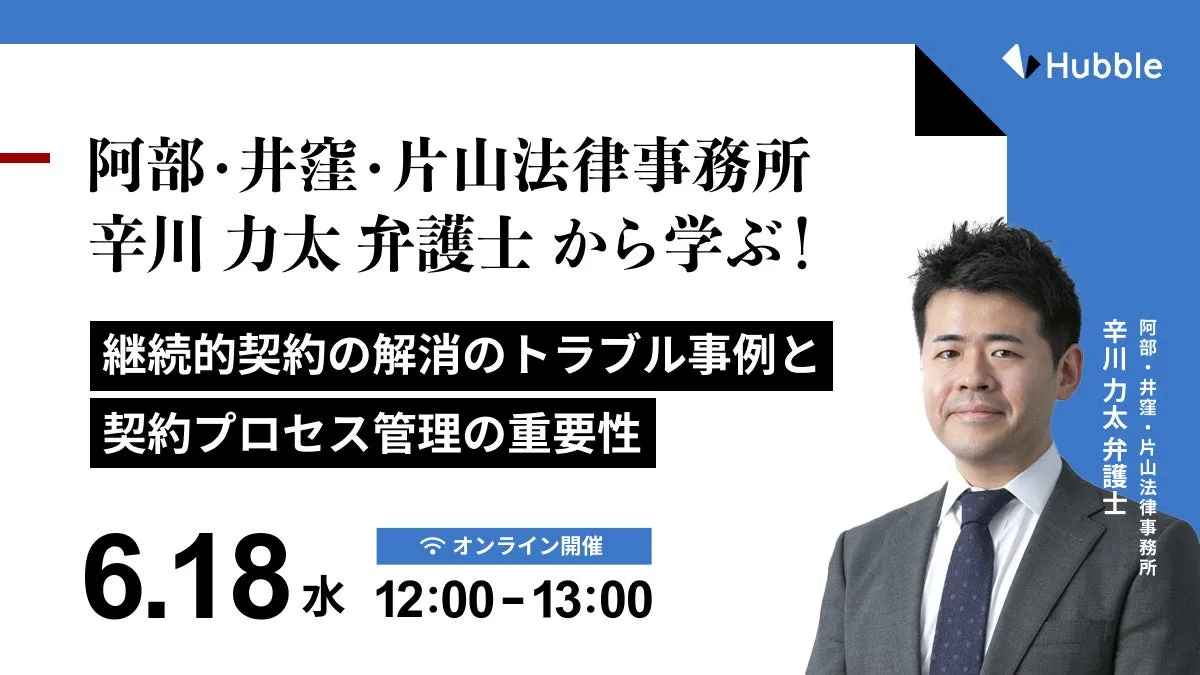 ビジネス環境が急速に変化する中、これまで続いてきた取引契約を見直す必要が生じる場面が増えています。特に、長期契約の終了時には、慎重なプロセス管理が求められます。2025年6月18日(水)、契約業務・管理クラウドサービス「Hubble」を提供する株式会社Hubbleが主催する無料オンラインセミナーでは、「継続的契約の解消のトラブル事例と契約プロセス管理の重要性」と題し、契約解消時の様々なトラブルについて扱います。