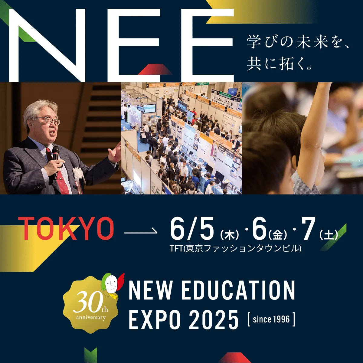 NEW EDUCATION EXPO(NEE)は1996年に始まり、今年で30回目を迎える教育関連のセミナー&展示会です。東京での開催に加え、札幌、仙台、名古屋、広島、福岡といった各地のサテライト会場でも一部のセミナーがリアルタイムで上映されます。また、大阪でも別日程で開催予定です。入場は無料で、公式サイトから事前申し込みが必要です。