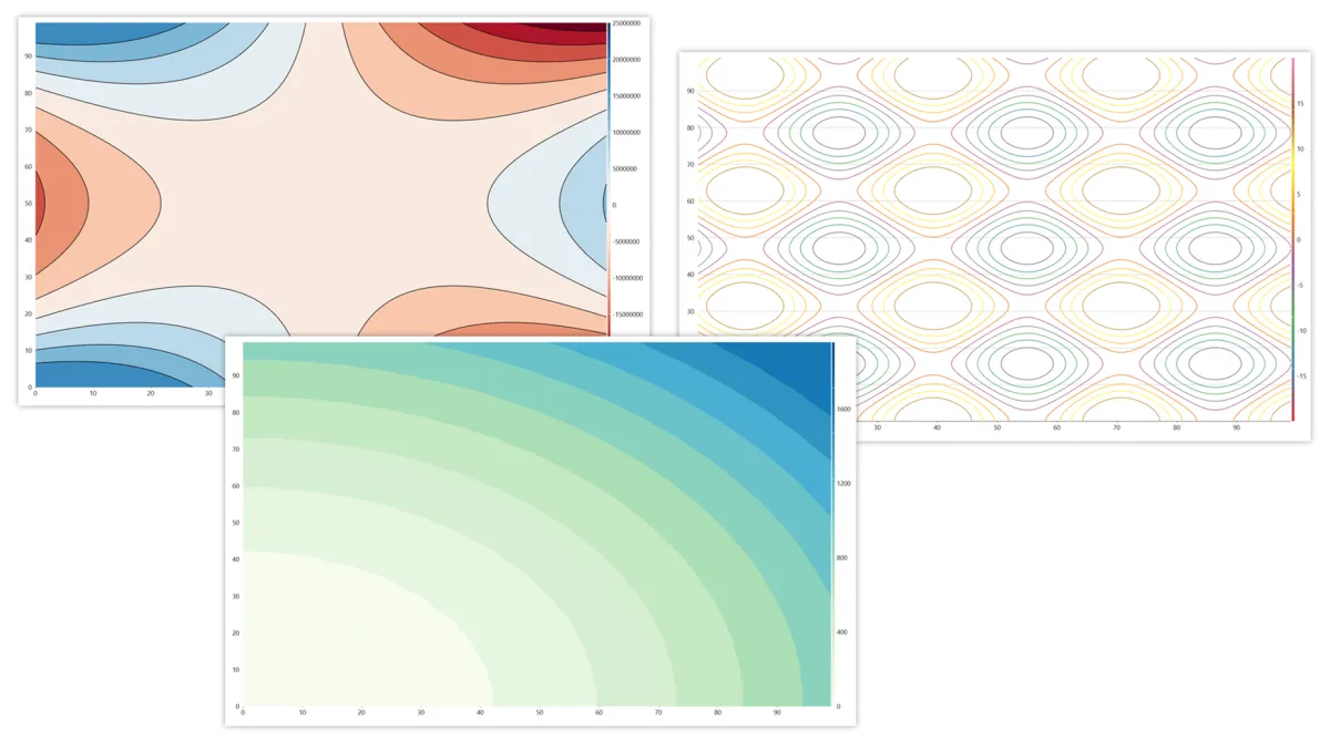 特筆すべきは、「FlexChart」コンポーネントに追加された2D等高線チャート機能です。この新しい機能により、三次元データの高低差を二次元平面上で直感的に視覚化することが可能になりました。データは色や線によって変化し、数値の分布や傾向を一目で把握できるようになります。この機能は、特に科学的データ、エンジニアリングのシミュレーション結果、統計分析、そして地理空間データなどの領域で活用できるでしょう。