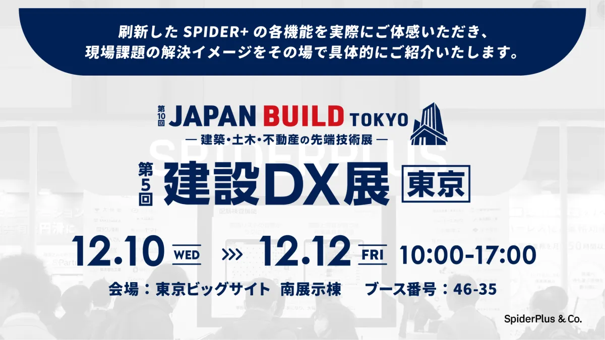 スパイダープラス株式会社は、2025年12月10日から12日まで、東京ビッグサイトで開催される【JAPAN BUILD-建築・土木・不動産の先端技術展-建設DX展】にブースを出展します。この展示会は、建設業界の最前線で活躍する企業や専門家が集い、最新の技術やサービスが紹介される一大イベントです。