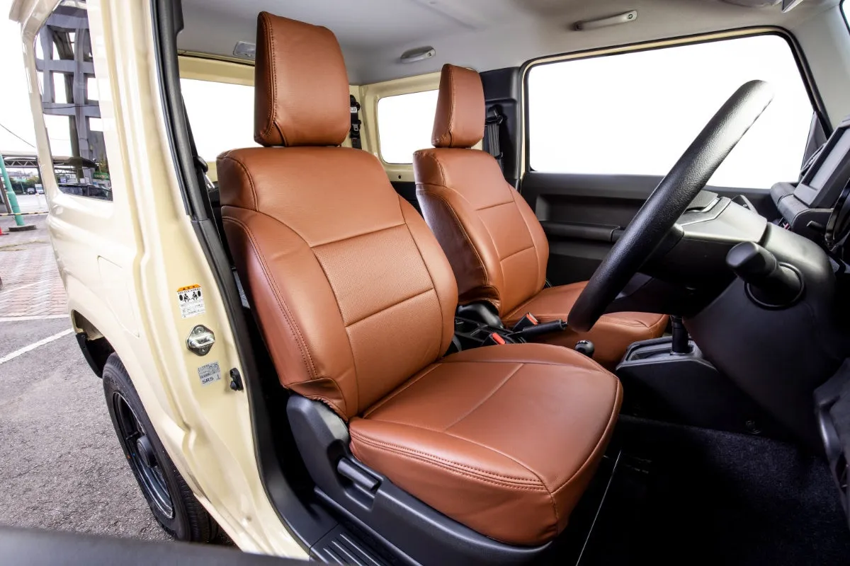 今回新発売されるシートカバーは、ブラウンとアイボリーの2色展開で、どちらも落ち着いた色合いがポイントです。このカラーは、ジムニーの純正インテリアと非常に相性が良く、インテリア全体を引き立てます。