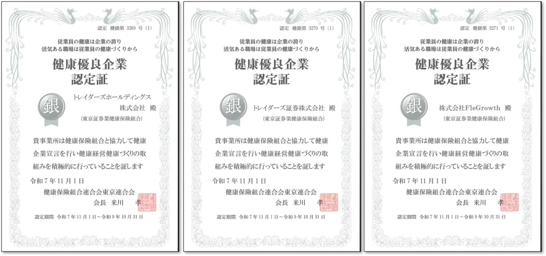 トレイダーズホールディングス株式会社とその関連企業であるトレイダーズ証券、FleGrowthが、健康保険組合連合会東京連合会から健康経営の実践を評価され、「銀の認定」が更新される運びとなりました。この「銀の認定」は、同社グループが2024年に初めて取得し、継続的な努力の証です。