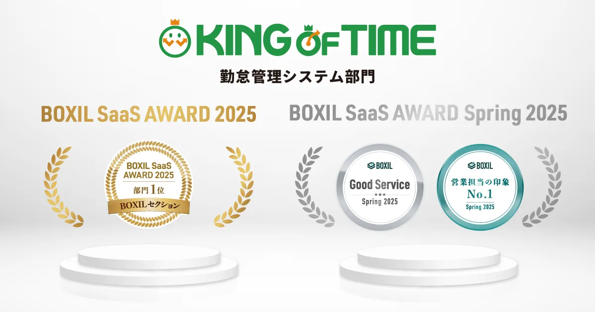 さらに同日に発表された「BOXIL SaaS AWARD Spring 2025」でも、「KING OF TIME」は勤怠管理システム部門の「Good Service」や「営業担当の印象No.1」にも選ばれ、サービスの質が認められました。