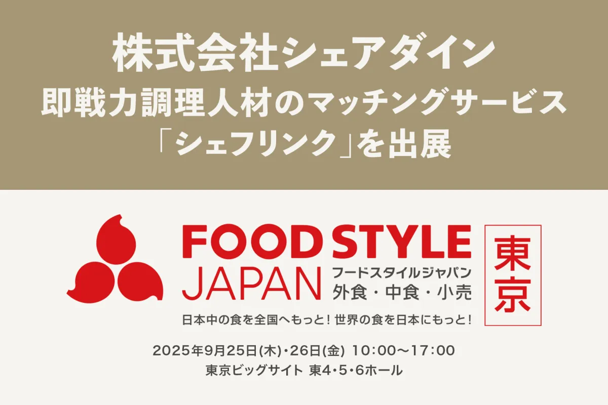 株式会社シェアダインが、2025年9月25日(木)から26日(金)まで東京ビッグサイトで開催される「FOOD STYLE JAPAN 2025」に出展します。ブース(小間番号:6A-8)では、料理人と飲食事業者をつなぐプラットフォーム「CHEFLINK」を紹介し、具体的な導入事例を通じて新たな人材活用の可能性を示します。