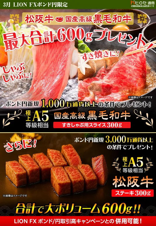 ヒロセ通商株式会社が提供するLION FXは、新たなキャンペーンを2026年3月2日から4月1日まで実施することを発表しました。今回のキャンペーンでは、ポンド円に注目した取引を行った利用者へ、松阪牛や国産高級黒毛和牛の贅沢なプレゼントが用意されています。