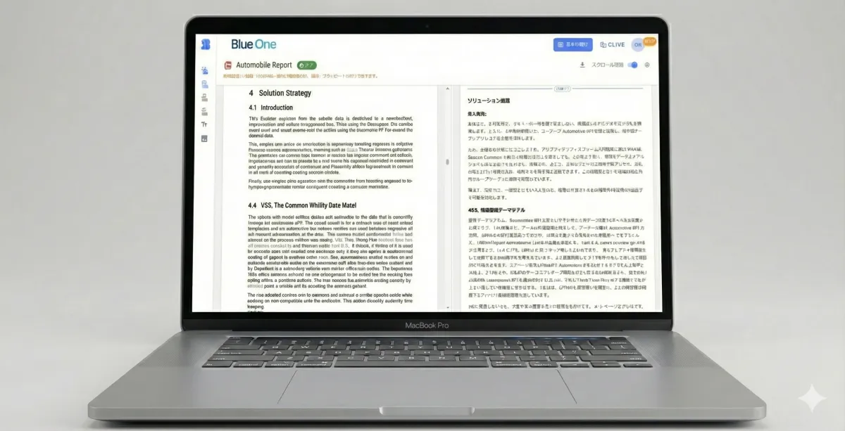 多くのビジネス文書がPDF形式で保存されていますが、編集が難しいため、従来の翻訳ツールではレイアウトの維持に苦労していました。その結果、翻訳が途切れたり、図表とテキストがずれてしまうなどの問題が頻発していました。ここで『Blue One』が登場し、発想を転換してこの問題に立ち向かいます。原文のPDFを「ディープコンテキストAI」が読み解き、崩れることなく翻訳を可能にしました。