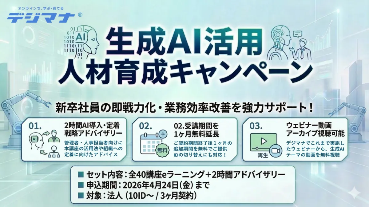 新卒社員の即戦力化を目指す株式会社新東通信が、オンライン学習プラットフォーム「デジマナ」で新たに『生成AI活用人材育成キャンペーン』を発表しました。このキャンペーンは、2026年3月に始まり、企業における生成AIの導入を支援することを目的としています。