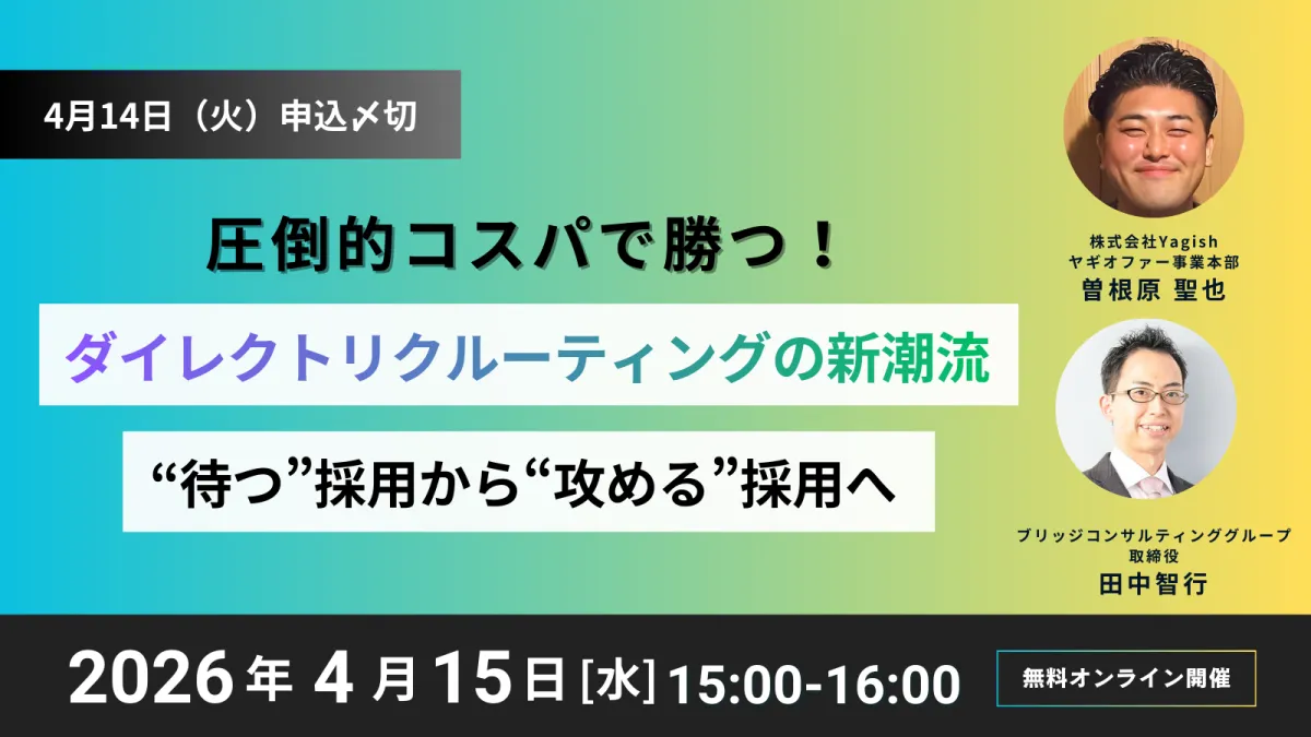 このセミナーでは、株式会社Yagishから曽根原聖也氏が登壇。彼は自身の経験を踏まえ、ダイレクトリクルーティング手法の具体化に努めています。また、ブリッジコンサルティンググループからは取締役の田中智行氏が参加し、戦略的な見地からの意見を述べます。