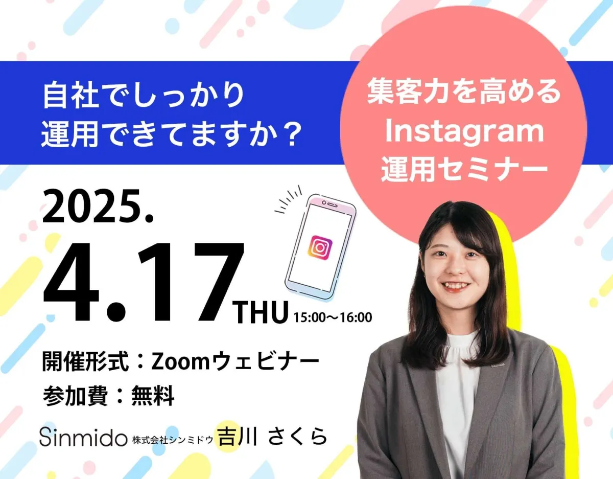 2025年4月17日(木)の15:00から16:00にかけて、株式会社シンミドウがZoomにて無料ウェビナーを開催します。このセッションでは、特に集客におけるInstagramの活用方法について、最新の機能や運用のコツを詳しくお伝えします。