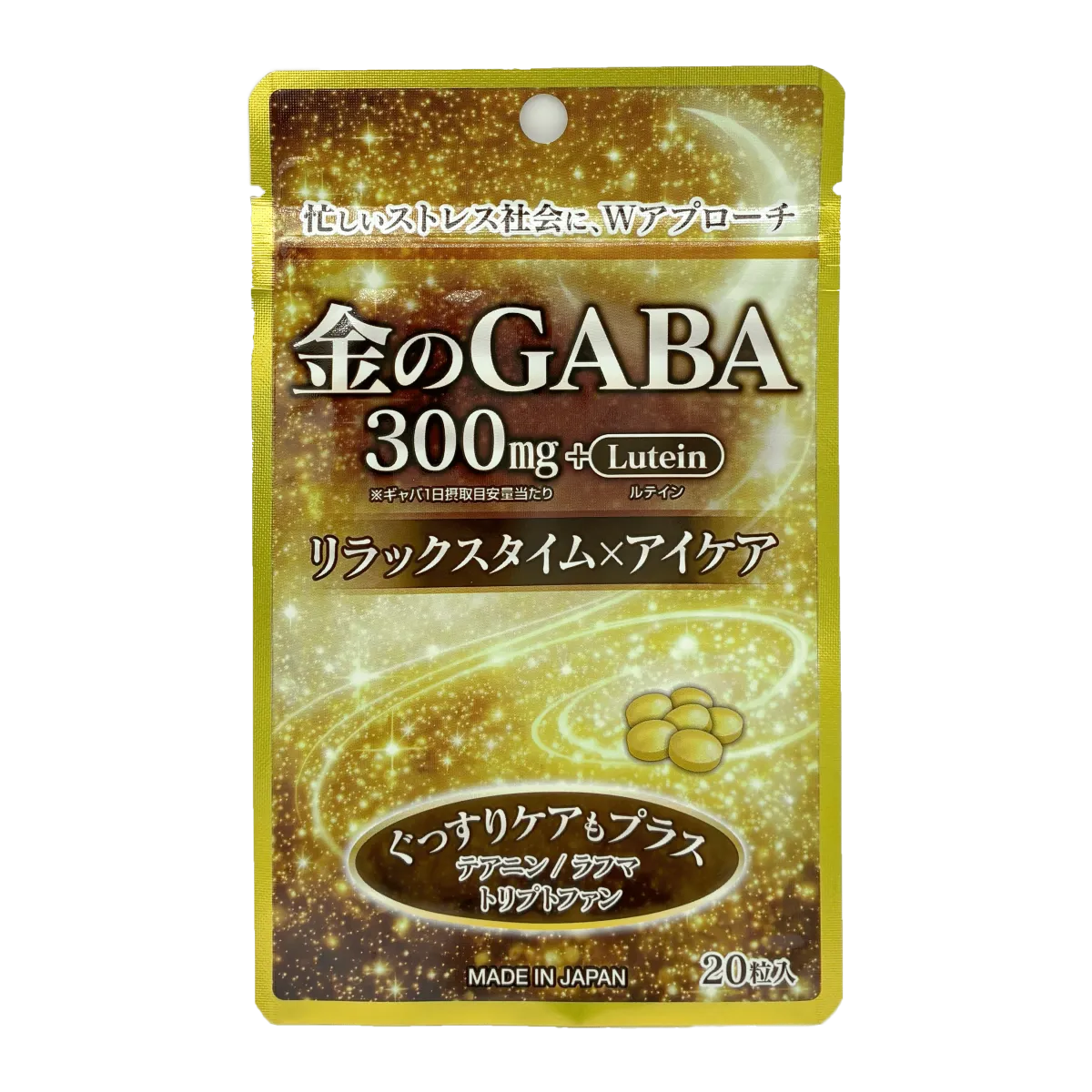 本商品は、1粒あたりに300mgのGABAを含有しています。GABAは体内で合成できない必須アミノ酸で、神経伝達物質ノルアドレナリンの過剰分泌を抑える効果があります。これにより副交感神経が優位になり、心地よい休息を促進します。また、忙しい現代人にとって欠かせないアイケア成分であるルテインもプラスされており、パソコンやスマホを長時間使用する人々の健康をサポートします。