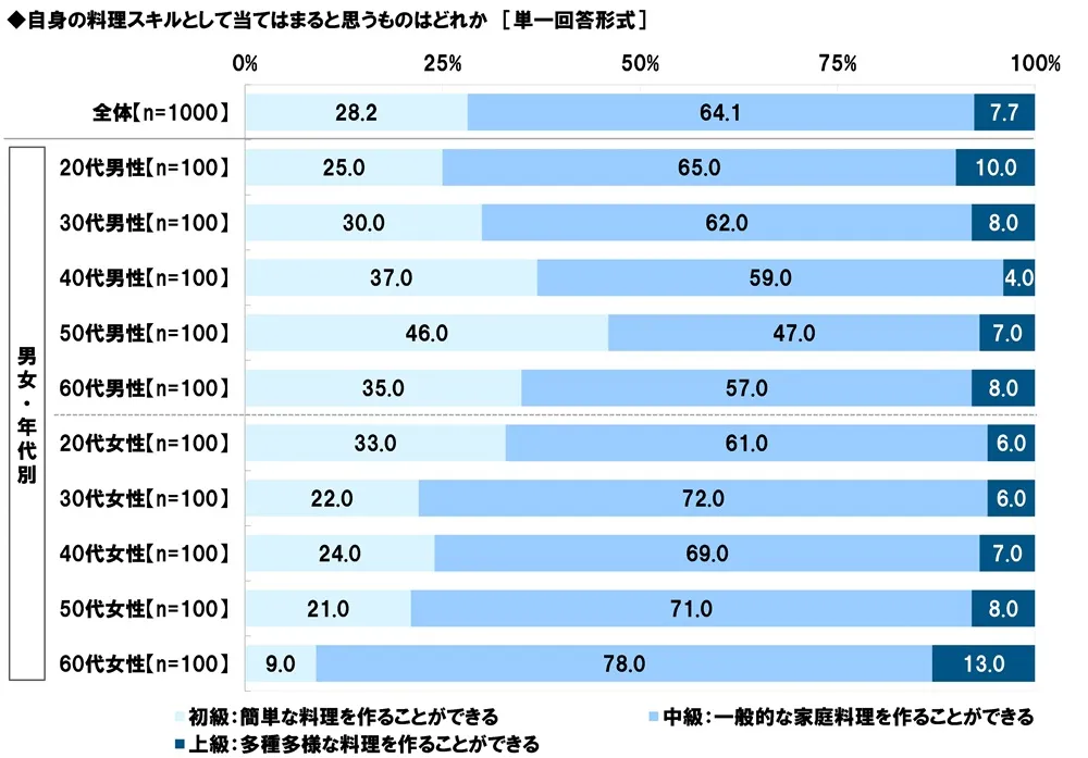 この調査によると、料理スキルの自己評価は「初級」が28.2%、「中級」が64.1%、「上級」が7.7%と、圧倒的に中級者が多いことが確認されました。特に50代男性が「初級」という回答を出す割合が高く、料理技術の習得についての世代的な観点も浮かび上がりました。コロナや健康意識の高まりが背景にある中、家庭料理スキルの向上が急務であることを示しています。