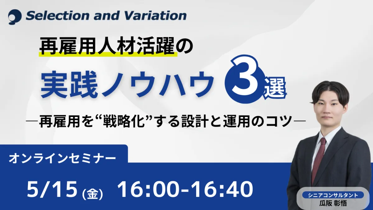 2026年5月15日(金)16:00から16:40、セレクションアンドバリエーション株式会社主催の『再雇用人材活躍の実践ノウハウ3選』セミナーが開催されます。東京、大阪、名古屋に拠点を持つこの組織は、組織や人事に特化したコンサルティングファームで、創業以来多くの企業に対して人事の改革を支援しています。