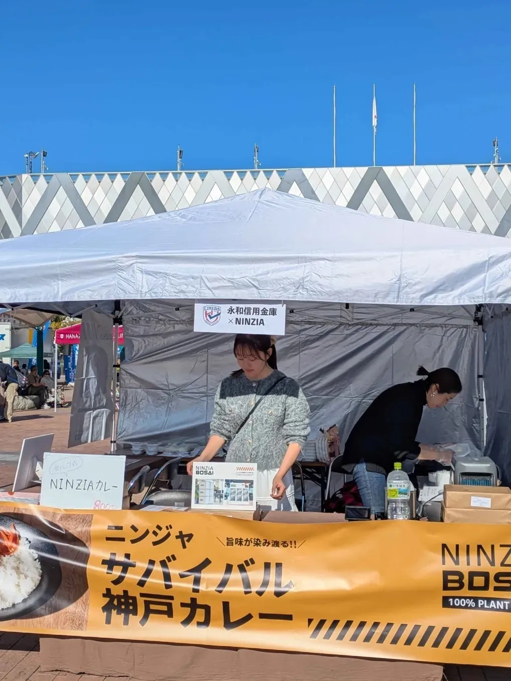 当日は、NINZIAが開発した「NINZIA BOSAI 欧風カレー」を提供・販売。現役選手にも試食してもらい、そのおいしさに驚く声が続出しました。このカレーは、食感と風味の両方を兼ね備え、次世代の防災食としての役割を担っています。