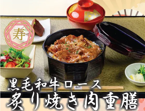 - - メニュー名: 黒毛和牛ロース炙り焼き肉重膳