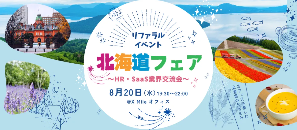 HR・SaaS業界に最新の風を吹き込むX Mile株式会社が、8月20日(水)に新宿で「HR・SaaS業界交流会」を開催します。その魅力的なテーマは「北海道フェア」。参加者たちは美味しい北海道フードを楽しみながら、業界の同僚や興味を持つ方々と交流を深めることができます。