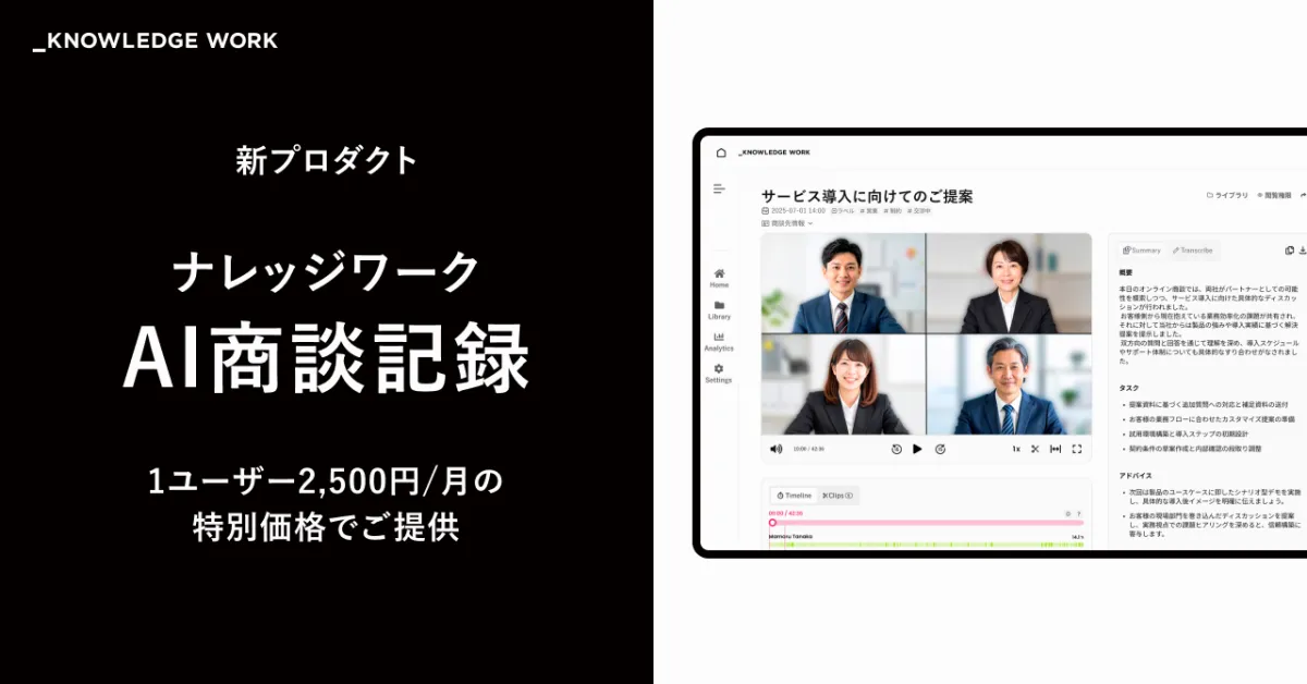 ナレッジワークは、2026年3月31日まで、この新サービスを1ユーザーあたり月額2,500円という特別価格で提供します。ただし、従業員数が1,000名以上の大手企業に限定され、Poetics社の商談解析AI「JamRoll」を契約中の企業は対象外となります。この機会にぜひご検討ください。