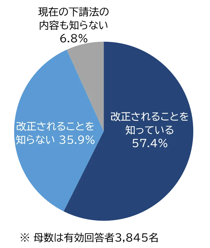 調査によれば、改正下請法の認知度は57.4%に達しており、これは全体的にみれば過半を超えていますが、実際には中小企業の認知度は54.3%とやや低めです。これに加え、法改正の恩恵を受ける可能性のある中小企業でこの認知度が低いことは、法律の効果を減少させる懸念があります。「改正されることを知らない」と回答した人の比率は35.9%に達し、現行の下請法についても知らないという声が6.8%も存在しました。