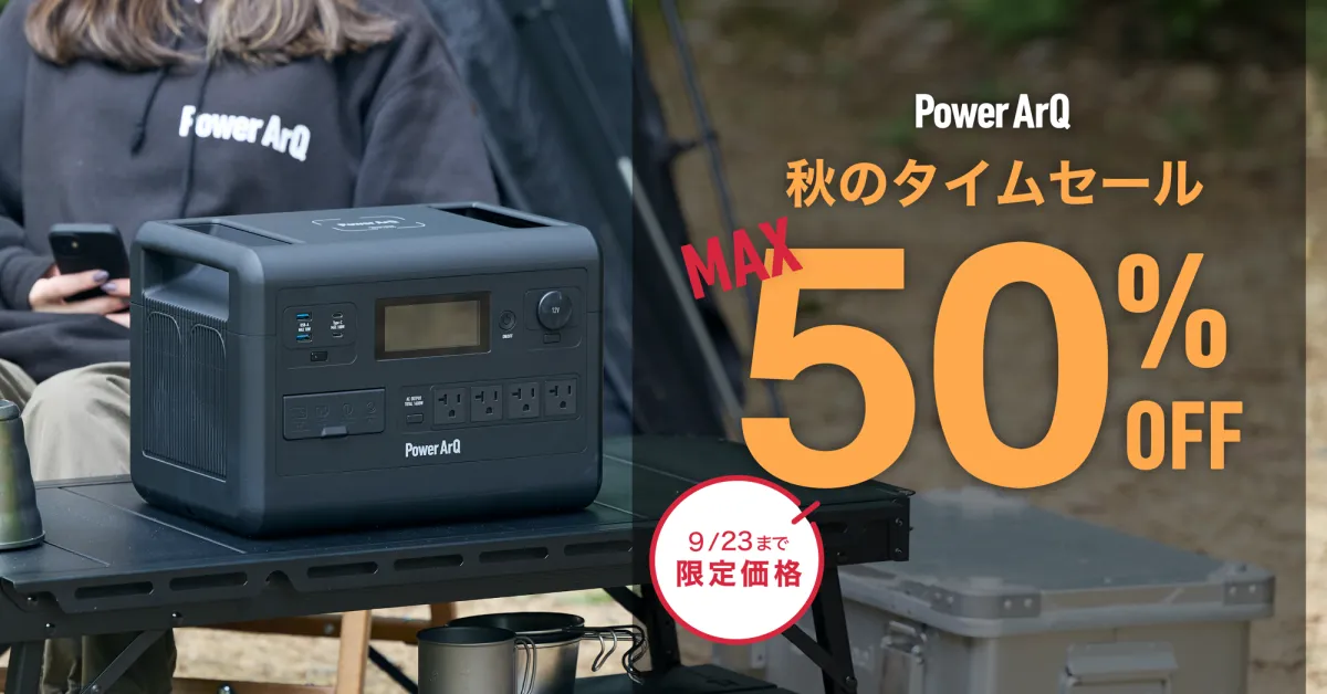 公式サイトにて「秋のタイムセール」が開催されています。このセールでは、アウトドアだけでなく、災害対策グッズとしての人気も高い「PowerArQ(パワーアーク)」の製品が多数ラインアップ。特に目を引くのは、ポータブル電源や冷蔵庫、発電機に至るまで、アウトドアライフを充実させるアイテムが揃っている点です。