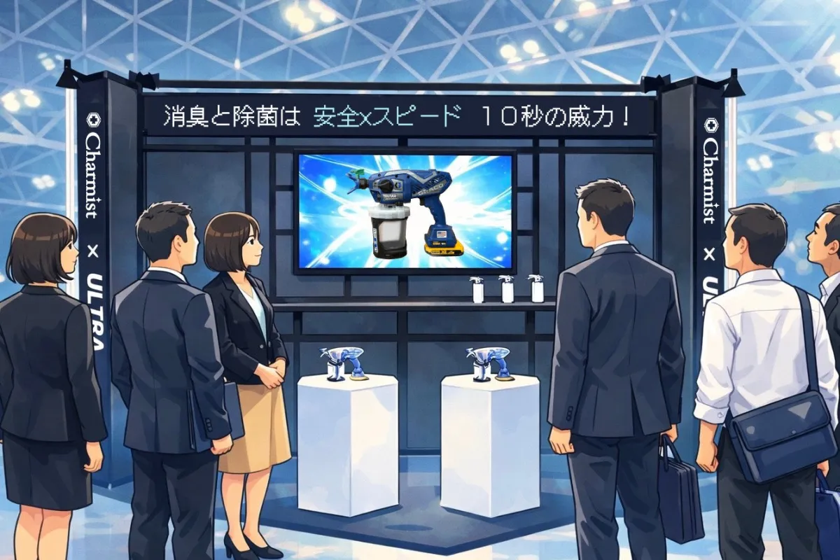 この展示では、除菌消臭剤「チャーミスト」と、米国のグラコ社製コードレス電動スプレーヤー「ULTRA MAX」を組み合わせたソリューションを中心に紹介します。特に注目は、ULTRA MAXと4Lのチャーミスト詰替用がセットになった「ULTRA MAX スタートキット」です。ULTRA MAXに取り付けるチャーミスト専用スプレーチップにより、微粒子を効果的に噴霧することが可能となります。