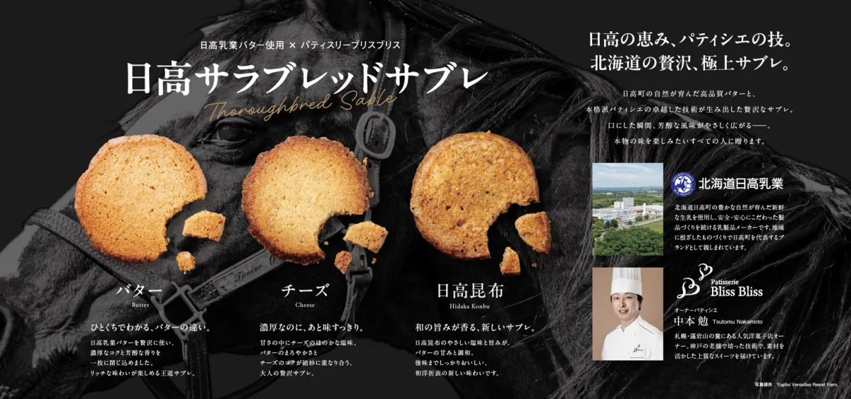このサブレは、日本有数の馬産地である日高町の文化を象徴するため、競走馬「サラブレッド」をモチーフにしたパッケージデザインが施されています。「Yogiboヴェルサイユリゾートファーム」から提供された写真を活かし、力強く美しい馬の姿が印象的です。