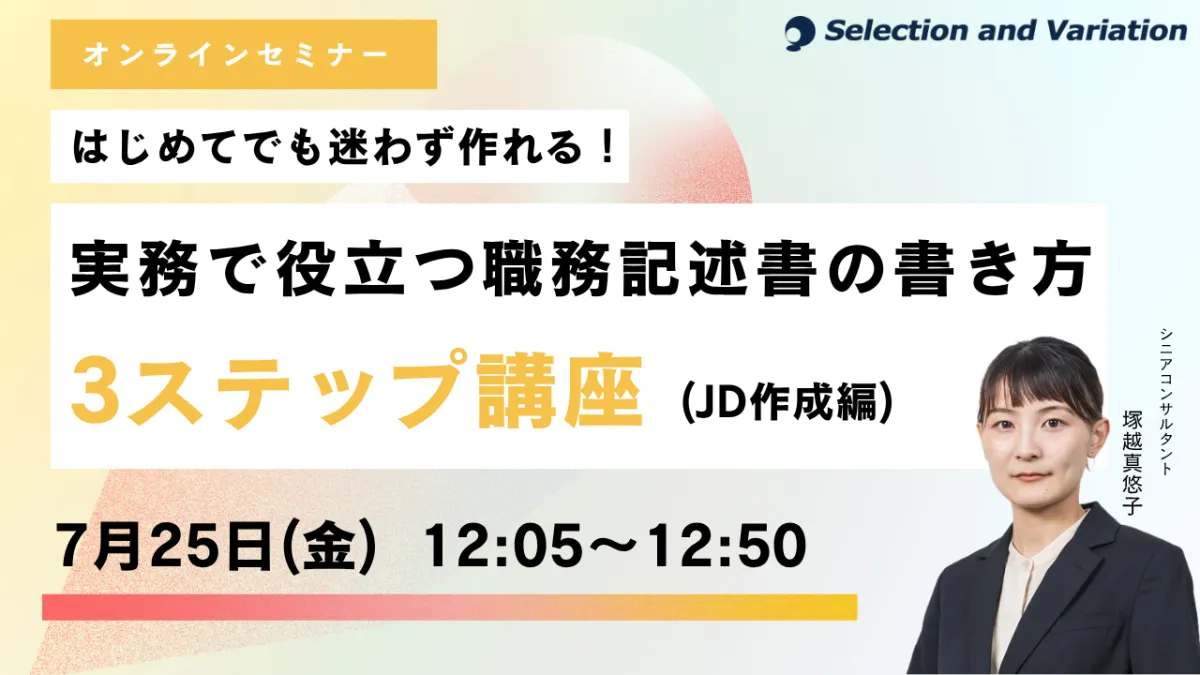 セレクションアンドバリエーション株式会社が主催するセミナー、"はじめてでも迷わず作れる!実務で役立つ職務記述書の書き方3ステップ講座(JD作成編)"が2025年7月25日(金)に開催されます。このセミナーでは、職務記述書(ジョブディスクリプション:JD)についての理解を深め、実際に役立つ作成方法を学びます。