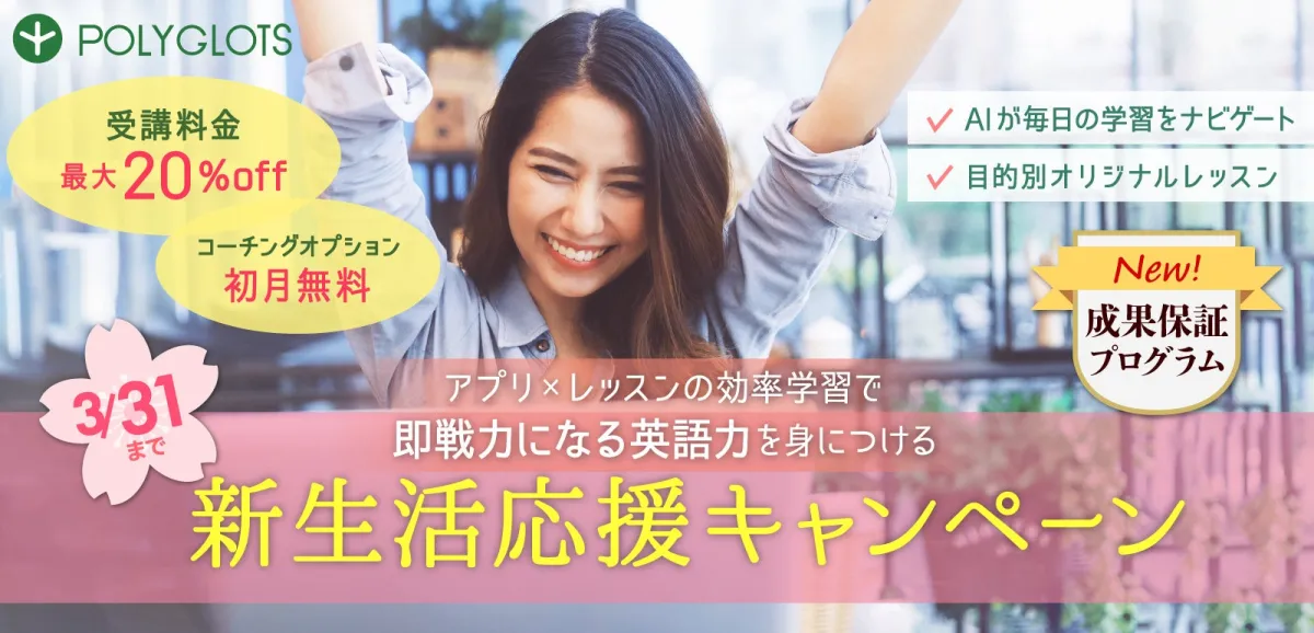 株式会社ポリグロッツ(本社:東京都新宿区、代表取締役:山口隼也)は、2025年3月31日まで期間限定の「新生活応援キャンペーン」を開始しました。このキャンペーンでは、英語学習を効率よくサポートする“コーチングオプション”を初月無料で体験できるほか、パーソナルレシピ型英会話プランの受講料が20%オフとなる特典も提供。新たな生活環境での挑戦を後押しするこの機会に、専属トレーナーと共に英語学習を進めてみませんか?