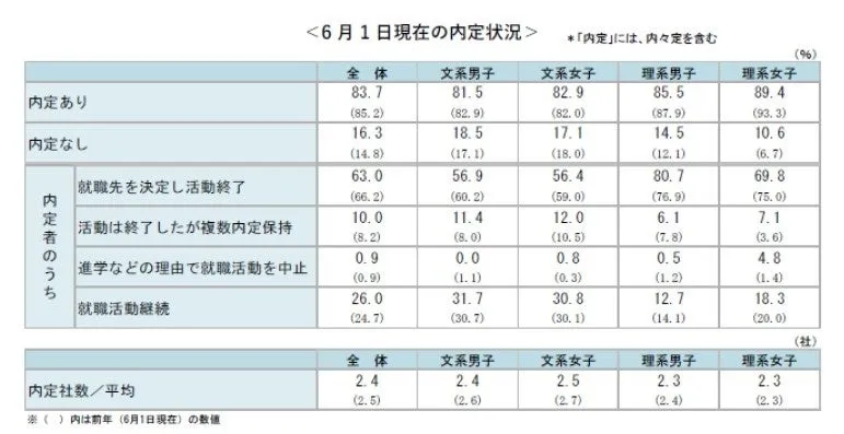 6月1日時点での内定率は83.7%となり、前年同期の85.2%をわずかに下回っています。全体の62%が就職活動を終了している一方で、38%は継続中です。この内訳には文系と理系で顕著な違いが見られ、文系学生の43.5%が継続しているのに対し、理系は26%にとどまります。