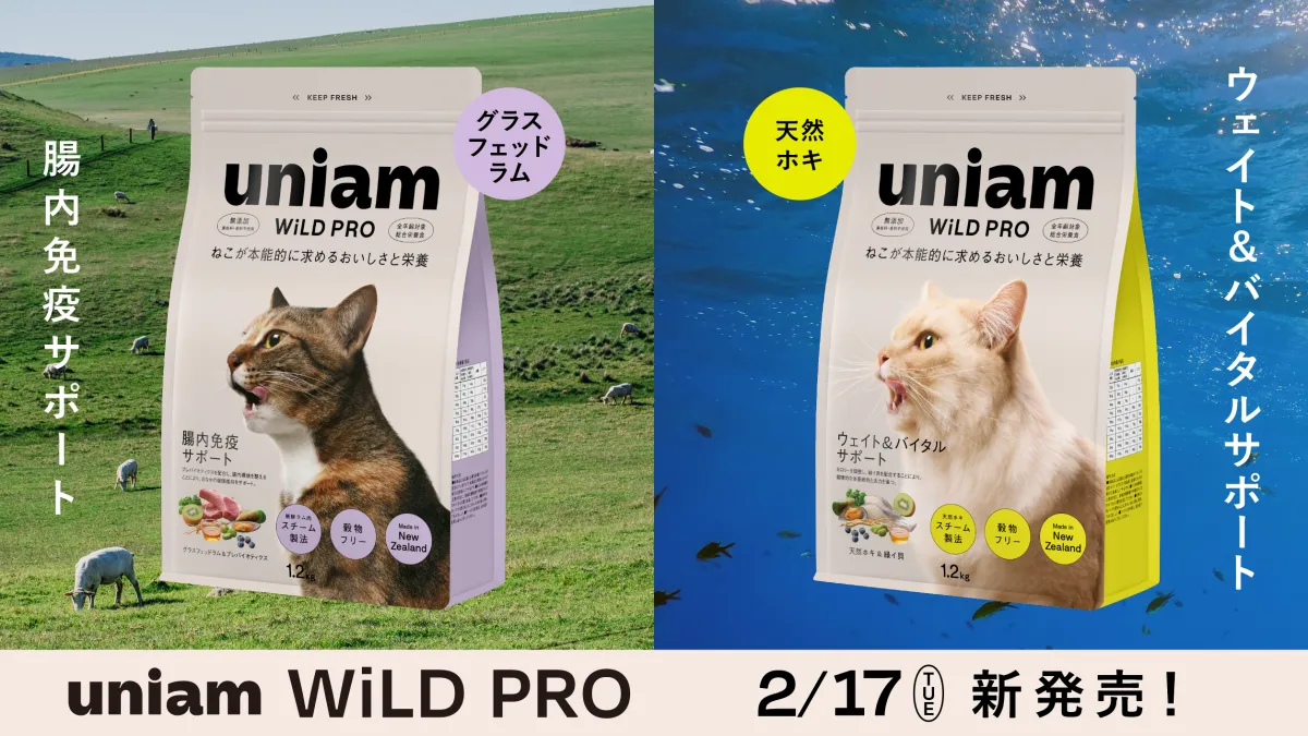 猫の健康を支えることを使命に掲げる株式会社uniamが、獣医師監修のドライフード「WiLD PRO」シリーズの新商品を発表しました。この新しいラインナップには「グラスフェッドラム&プレバイオティクス(腸内免疫サポート)」と「天然ホキ&緑イ貝(ウェイト&バイタルサポート)」の2種類が含まれます。2026年2月17日(火)から公式サイトや各店舗で順次販売が開始されます。