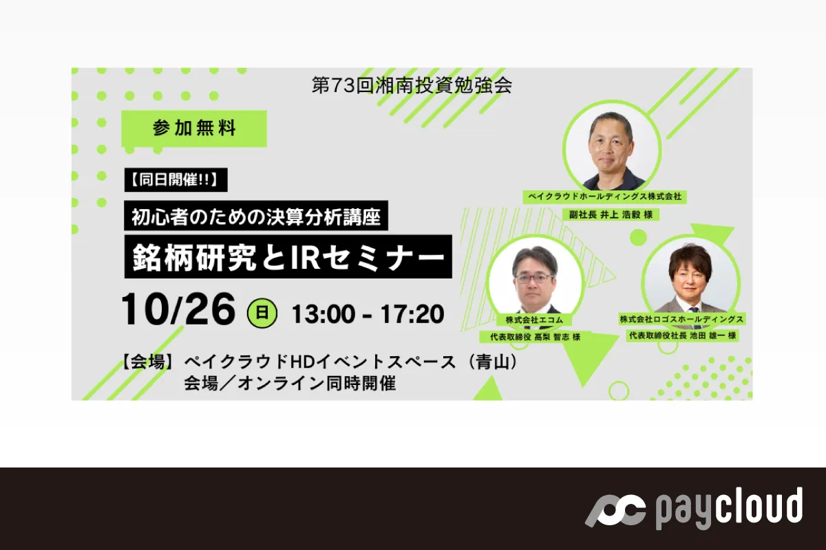 2025年10月26日の日曜日、湘南投資勉強会にてIRセミナーが開催されます。ペイクラウドホールディングス株式会社の副社長である井上が登壇し、企業の成長戦略とビジネスモデルについて講演を行います。セミナーは、初心者向けの決算分析講座と本社を含む3社によるIRセミナーという2部構成で行われます。特に、ペイクラウドの登壇は14:00から15:00の予定で、キャッシュレスサービスやデジタルサイネージ、ソリューション事業という多岐にわたる業績について触れられる内容となっています。今回の勉強会は2018年から続いている個人投資家向けのイベントであり、過去には日本株や米国株を中心に、企業を招いたIR説明会やディスカッションが行われてきました。参加方法は無料で、会場での参加とオンライン参加が可能です。オンラインで参加する場合は、事前申し込みがなくても視聴でき、事前に申し込むと当日の資料がメールで送付されます。このように、多様な参加形式が用意されているため、興味のある方はぜひご参加ください。セミナーは午後13時から17時20分まで行われます。この機会に、ペイクラウドホールディングスのビジネスについて深く理解を深めるチャンスです。詳細は申し込みページから確認でき、IRセミナーでの貴重な情報を受け取ることができる機会を見逃さないようにしましょう。