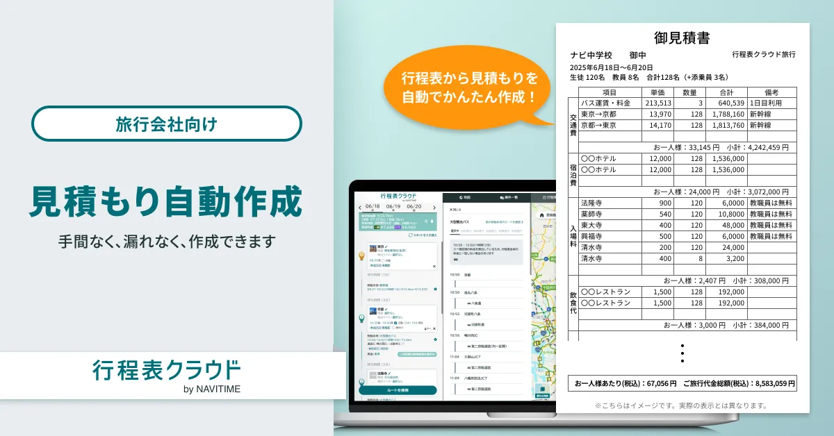 このような負担を軽減するために、ナビタイムジャパンは「見積もり作成」機能を開発しました。この機能は、自社の行程表作成機能と統合されており、旅行会社が行程表を作成する際に、簡単に見積もりを生成できる仕組みです。