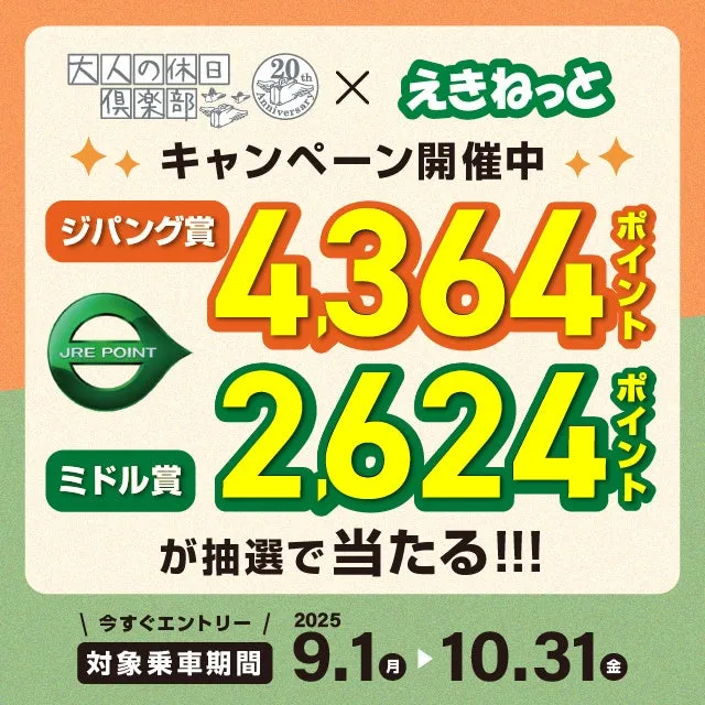 「えきねっと」を通じて、大人の休日倶楽部割引が適用されたきっぷを購入したお客様を対象に、抽選で豪華賞品をプレゼントします。ジパング会員の方にはジパング賞、ミドル会員にはミドル賞が用意されており、当選者にはそれぞれJRE POINTが贈呈されます。