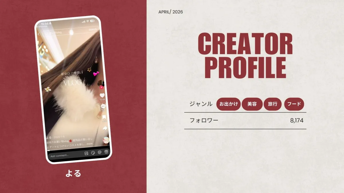 「よる」は、TikTokでフォロワー8,174人を抱え、日常をテーマにしたコンテンツを発信しています。彼女の投稿は、視聴者の心に寄り添う形で、お出かけや美容、フード、旅行など多岐にわたるテーマを扱っています。