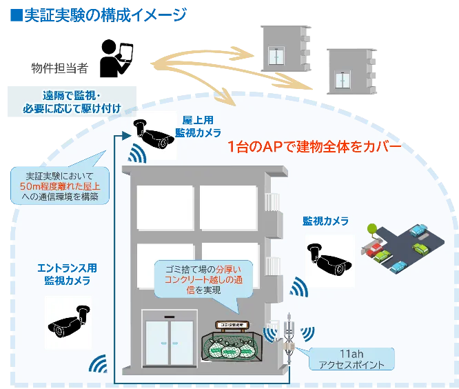 本実験では、Wi-Fi「IEEE802.11ah」のアクセスポイントを設置し、管理対象のマンション全体をカバーする無線環境を構築しました。その上で、複数台のカメラを設置し、建物の遠隔監視を実現しました。これにより、業務の効率化と物件価値の向上を図ることが目的となりました。