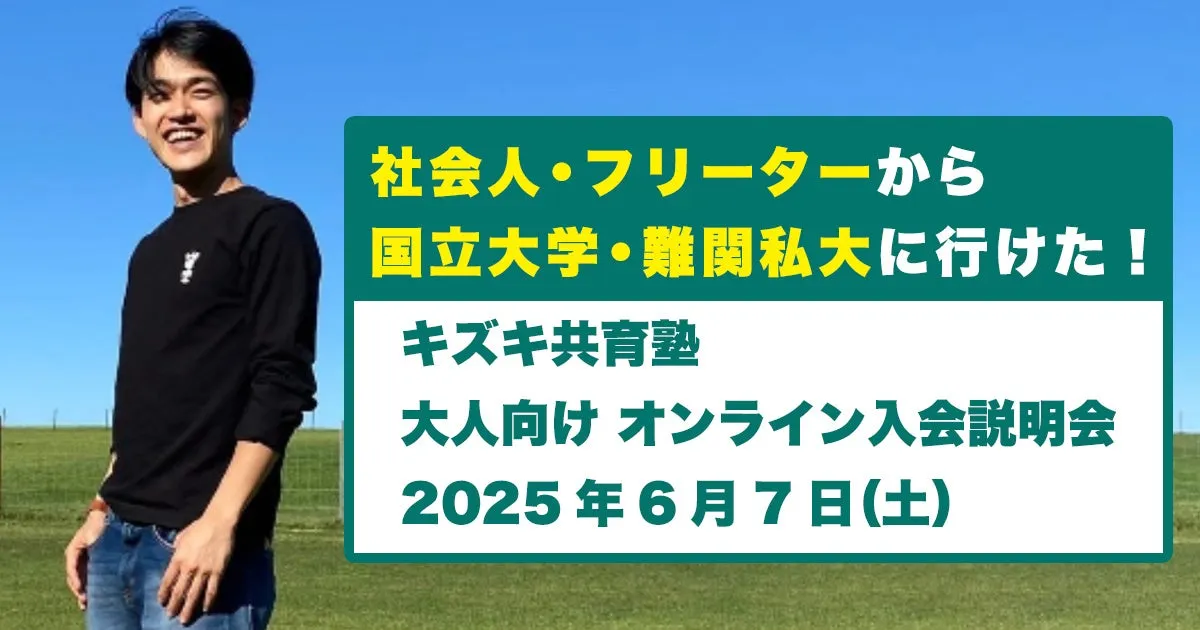 2025年6月7日、キズキ共育塾は「大人の大学合格」をテーマにした無料オンライン説明会を開催します。この説明会では、社会人、フリーター、主婦、そして定年後の方々も対象に、大学受験の具体的な手法や成功事例を紹介します。