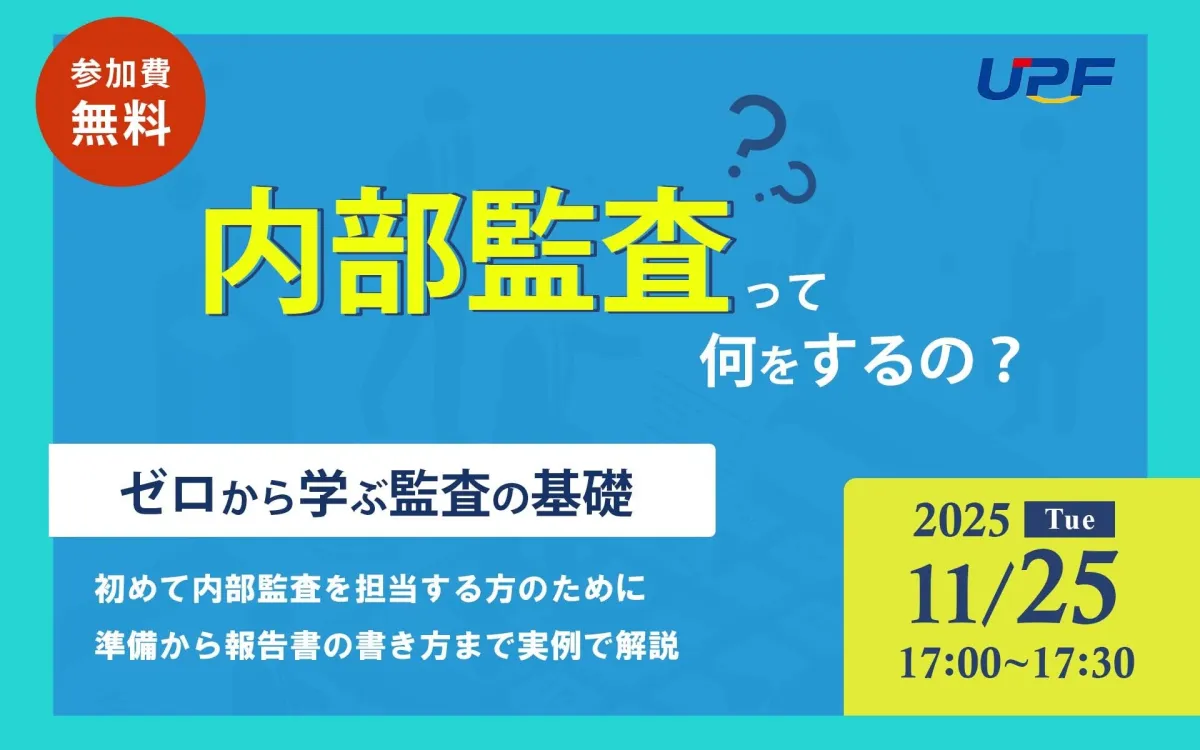 内部監査に関するスキルを身につける絶好の機会が、2025年11月25日(火)に提供されます。リスクマネジメント分野でコンサルティングサービスを展開する株式会社UPF(本社:東京都中央区)は、初めて内部監査を担当する皆様を対象にした無料オンラインセミナーを開催します。
