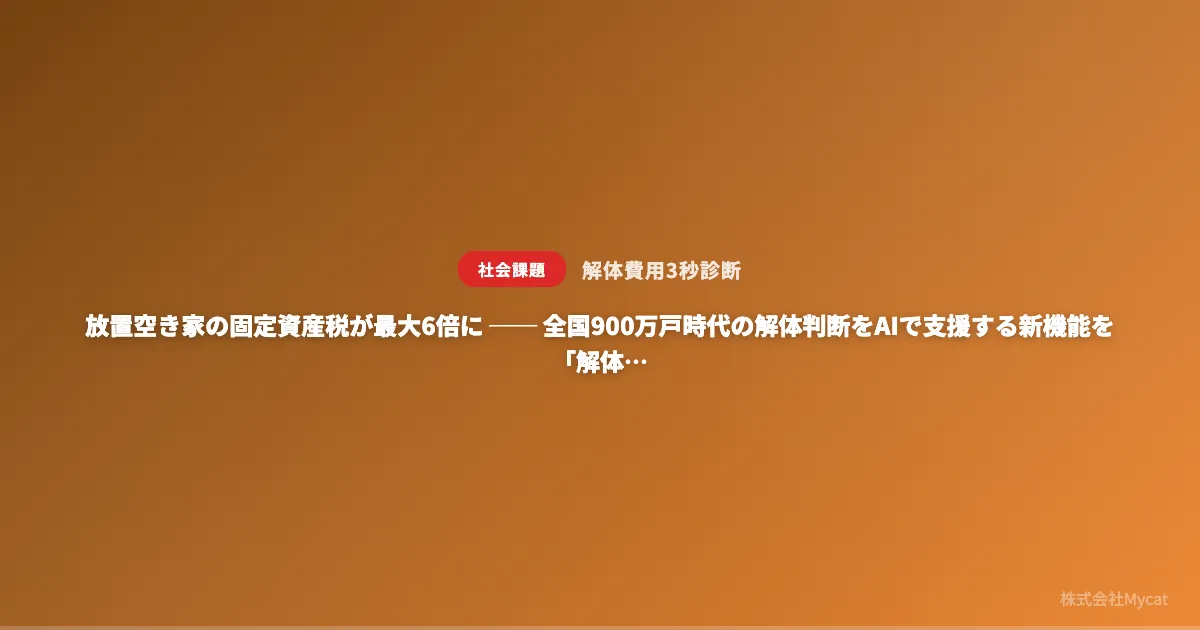 株式会社Mycatが提供する「解体費用3秒診断」には、国や地域が抱える空き家問題を解決する重要な手助けとなる機能が盛り込まれています。これからも増加し続ける空き家問題に対し、AI技術を活用したソリューションが更に進展することが期待されます。