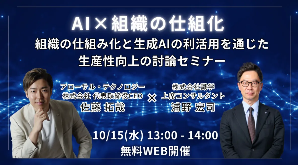 アローサル・テクノロジーの企業理念である「AIの力で、世界を'わかりやすくする'」に基づき、参加者が生成AIを有効に活用するための仕組みを学びます。セミナーの主催は識学社です。