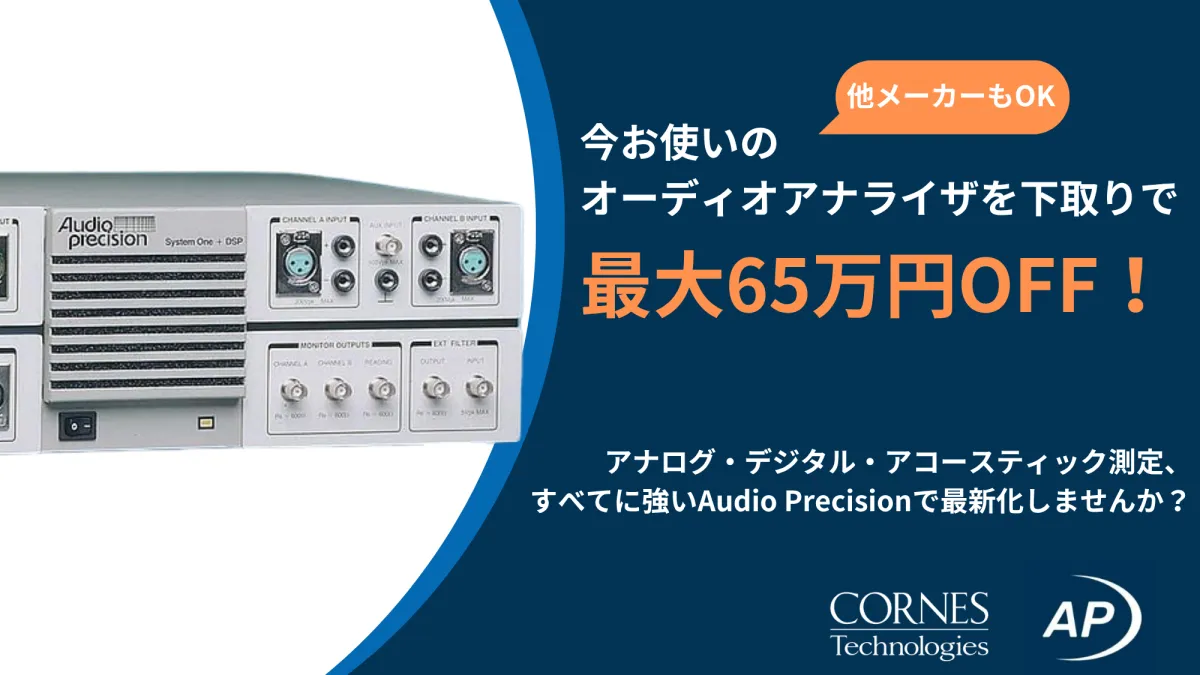 コーンズテクノロジー株式会社が、Audio Precisionオーディオアナライザの新モデルへお得に買い替えができる、下取りキャンペーンを開始しました。このキャンペーンでは、他社製のオーディオアナライザや旧モデルを下取りに出すことで、なんと最大65万円の割引を受けることが可能です。