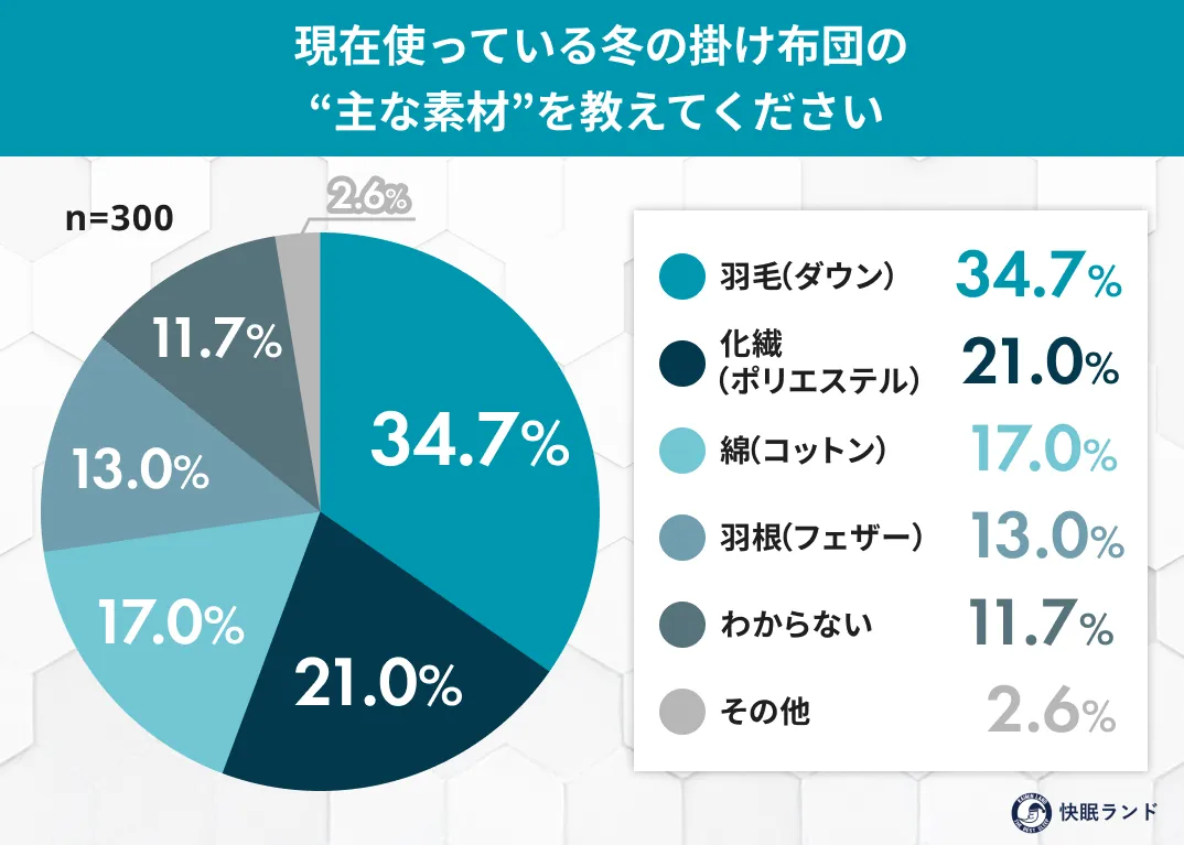 最近の調査では、現在使用している掛け布団の素材の最多は「羽毛(ダウン)」で34.7%を占めています。次いで「化繊(ポリエステル)」や「綿(コットン)」などが続き、手入れのしやすさや扱いやすさを重視する家庭も多いことが分かります。