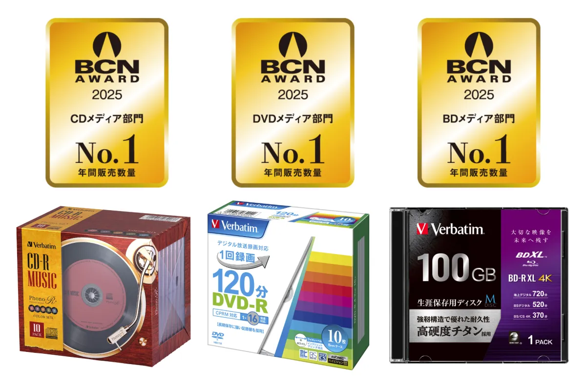 Verbatim Japan株式会社が、『BCN AWARD 2025』でCDメディア、DVDメディア、BDメディアの3部門で最優秀賞を受賞したことが発表されました。