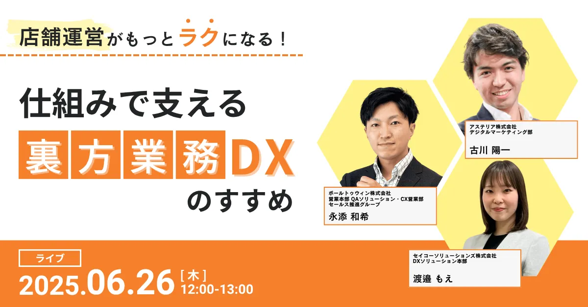 2025年6月26日(木)、ポールトゥウィン株式会社が主催するウェビナー「店舗運営がもっとラクになる!仕組みで支える“裏方業務DX”のすすめ」がオンラインで開催されます。今回のウェビナーは、店舗運営を行う企業や業務支援部門の方々に向けて、バックオフィス業務の効率化を促す内容が盛り込まれています。