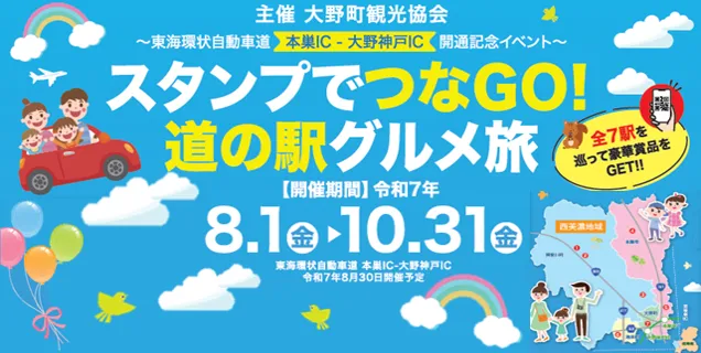 一般社団法人日本自動車連盟(JAF)岐阜支部では、2023年8月30日(土)に開通した東海環状自動車道本巣ICから大野神戸ICを記念して、2025年8月1日(金)から10月31日(金)までの期間に「スタンプでつなGO!道の駅グルメ旅」というドライブスタンプラリーを開催します。このイベントは大野町観光協会が主催し、JAF岐阜が協力する形で実施されます。