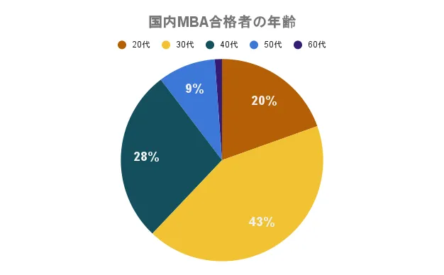 まず、年齢に関するデータです。国内MBAに合格した受講生の80%が30代以上であり、その中でも最も多い年齢層は30代で43%を占めています。この結果は、MBA取得を目指す人が多くの経験を積んだ後に挑戦する傾向があることを示しています。いわゆる"キャリアアップ"を目指してMBAに挑戦する人々が増加していると考えられます。
