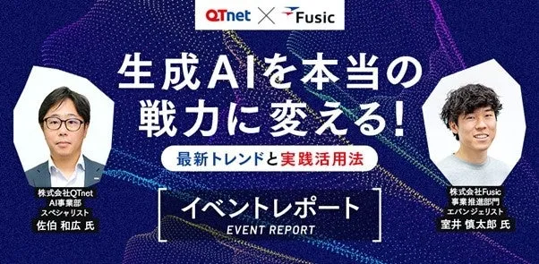 特に、生成AIの導入に関心がある方々に向けて、最新トレンドや業務での活用のヒントが提供されました。登壇者には、QTnetのAI事業部スペシャリスト・佐伯和広氏、Fusicのエバンジェリスト・室井慎太郎氏が名を連ね、参加者に向けた実体験と成功事例を交えた内容が展開されました。