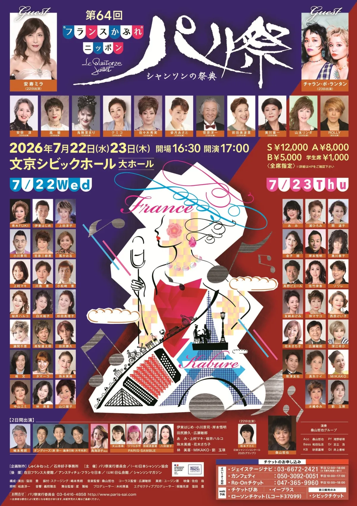 フランス革命記念日である7月14日を祝い、日本最大のシャンソンコンサート、いわゆる「パリ祭」が再びその幕を開けます。このイベントは1963年に石井好子の発案によって始まり、以来、日本におけるフランス文化の象徴的な催しとして広く愛されてきました。2026年は第64回を迎えるこの祭典が、東京の文京シビックホールを舞台に細部にわたってブラッシュアップされ、さらなる魅力をあなたにお届けします。